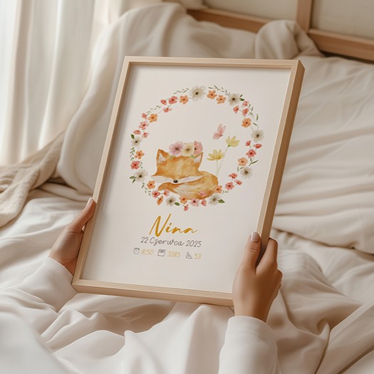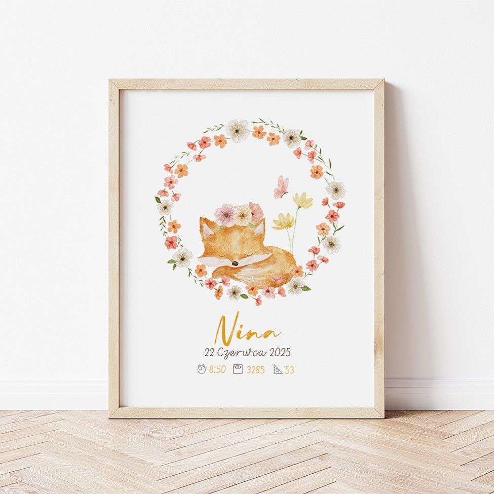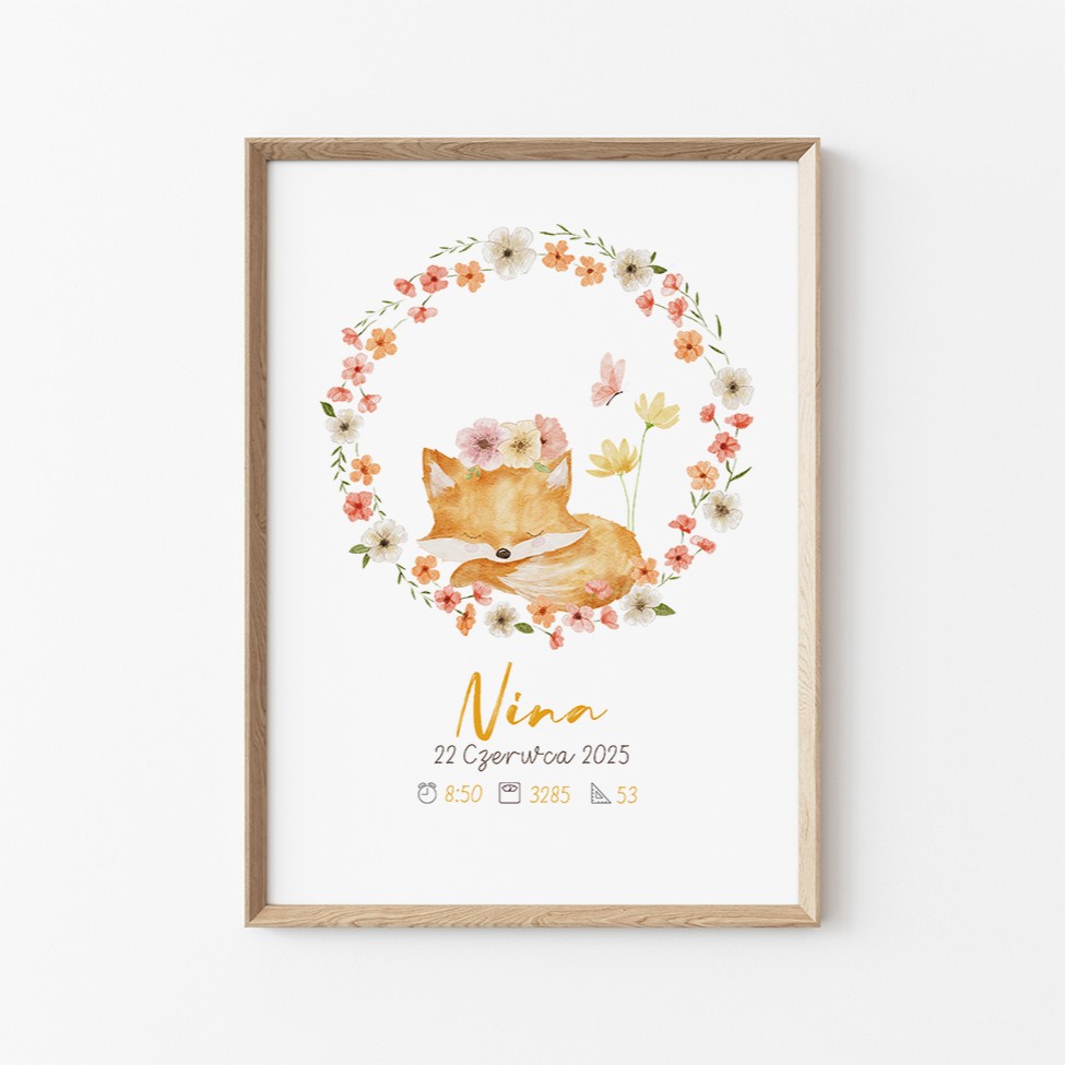 Napisz pierwszą opinię o „Plakat z imieniem dla dziewczynki z liskiem i kwiatami”