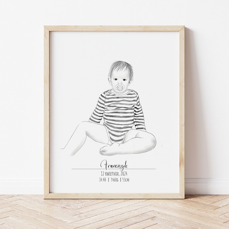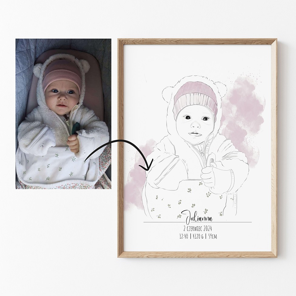 📸 Uwiecznij pierwsze chwile dziecka w formie spersonalizowanego portretu. Każde dziecko jest wyjątkowe, a ta metryczka to coś więcej niż zwykły obraz, jest oparta na prawdziwym zdjęciu. Przenoszę emocje i detale na papier w delikatnym, akwarelowym stylu, dzięki czemu portret wygląda jak malowany farbami wodnymi.